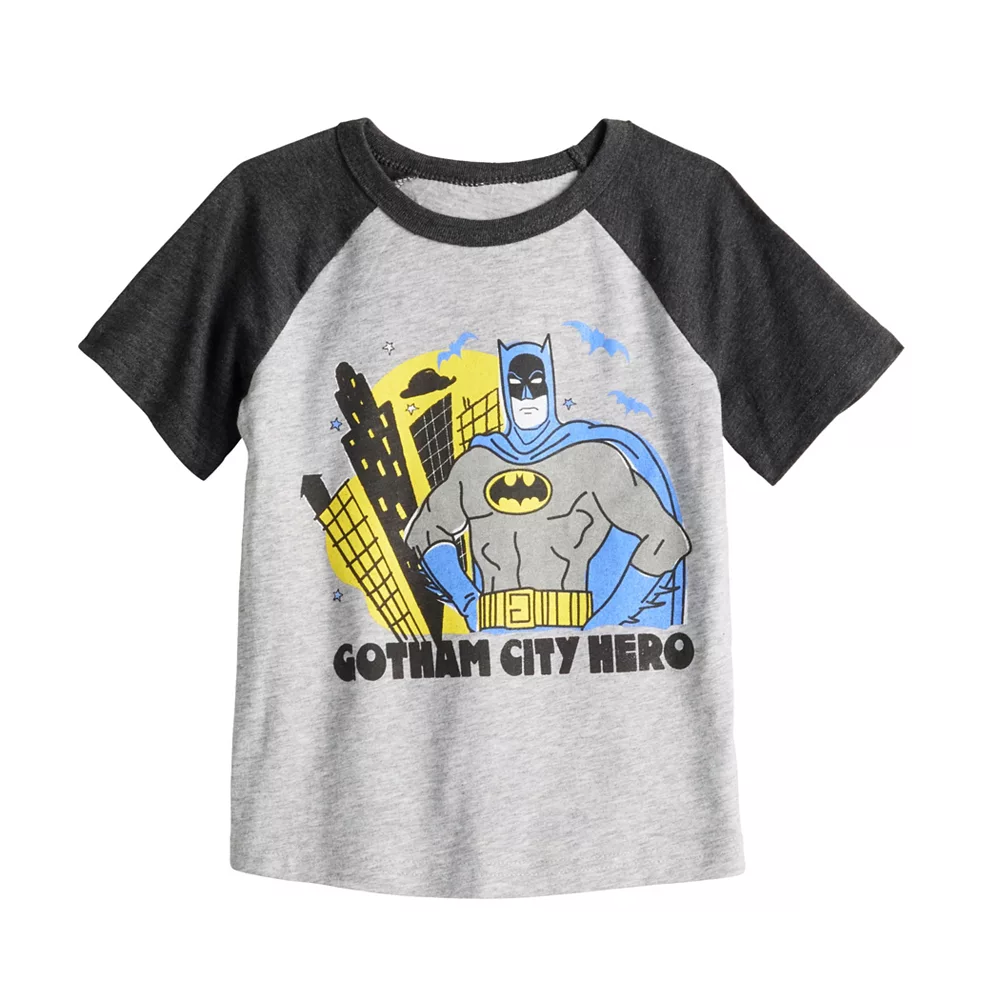 Your little guy will love wearing this toddler boys’ Batman “Gotham City Hero” short raglan sleeve graphic tee from Jumping Beans.