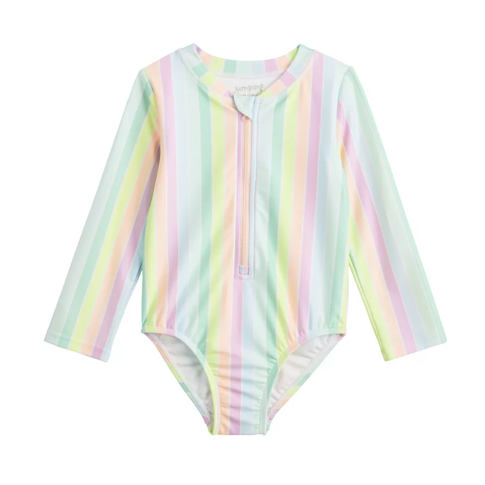 She’ll make a splash in this girls’ Jumping Beans one-piece rash guard.