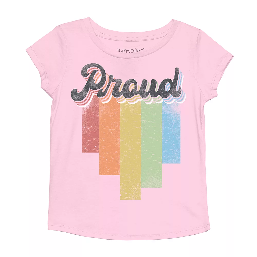 Make a statement during Pride Month—and all year long—with this toddler girls’ vintage-inspired “Proud” rainbow Pride graphic tee from Jumping Beans.