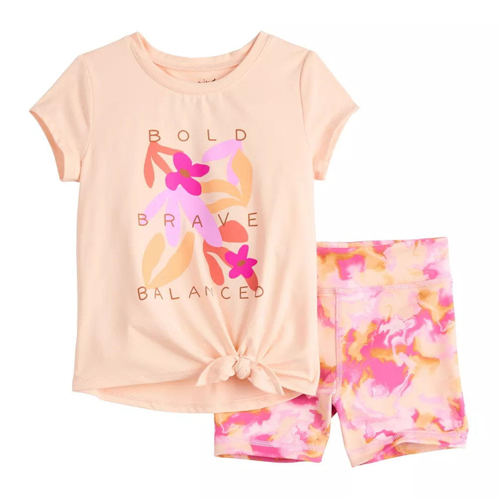 Perfect for days full of games and play, she’ll love the all-day comfort and cute style of this girls’ Jumping Beans tie-front top and bike shorts set.